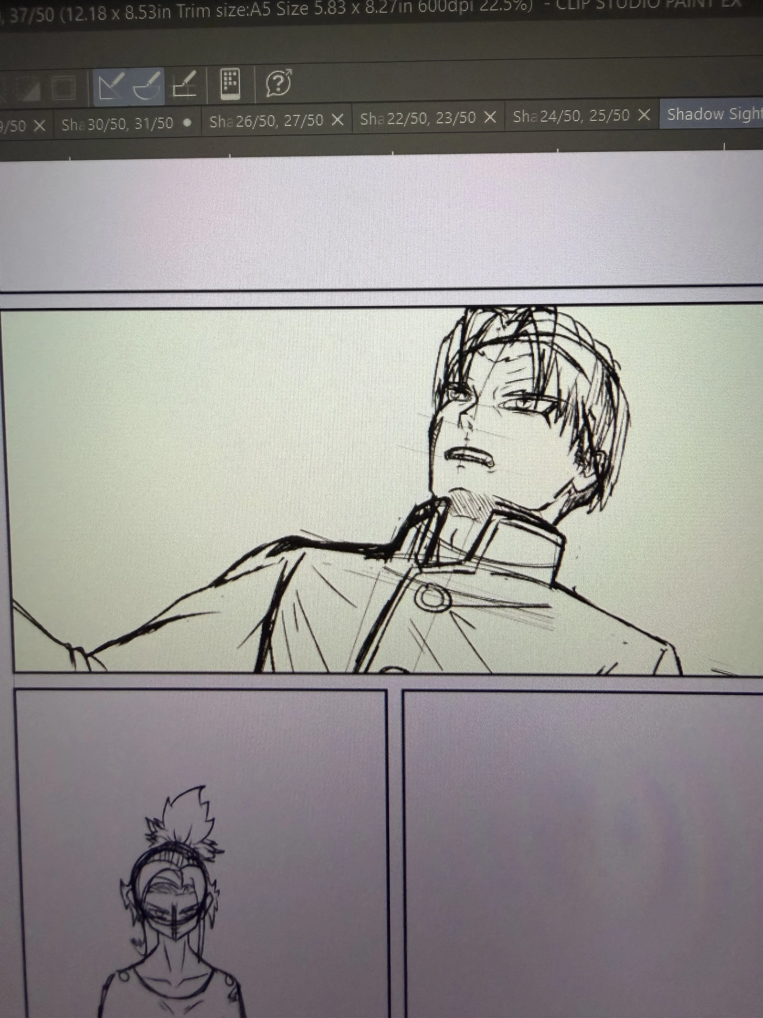 3 Days behind schedule, But I have officially finished May’s chapter! This one has a ton of dialogue, it was hard to fit it all in, but I think overall it's a great look chapter! I pushed myself with new and weird angles this time. Here’s a rough draft of part of the page!